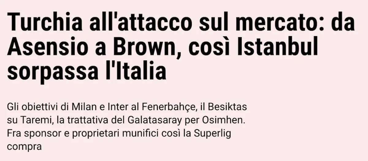 Tutto Mercato ise dikkat çeken bir analiz yayınladı: “Türkiye, oyuncular için servet kazanma ve hâlâ en üst düzeyde rekabet etme fırsatının bir arada sunulduğu nadir liglerden biri haline geldi. Bu nedenle Avrupa devlerinin listesinde olan oyuncular, tercihini Türkiye’den yana kullanıyor.”